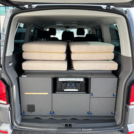 Il tetto a soffietto skyup nasce, per questo modello, già provvisto del buco per l'oblò. Inoltre grazie al nostro lavoro di allestimento abbiamo provveduto a creare dei pensili da riporre nel posteriore del van per dare la possibilità al cliente di usufruire di ancora più spazio per i suoi viaggi in libera.