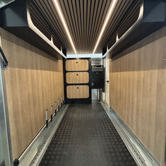 Realizzazione di angolari su misura per sportelli interni del veicolo con marchio personalizzato prodotto tramite la stampante 3d, di un lavandino a scomparsa e di un ripiano scorrevole. Installazione di luci a led blu notturne.